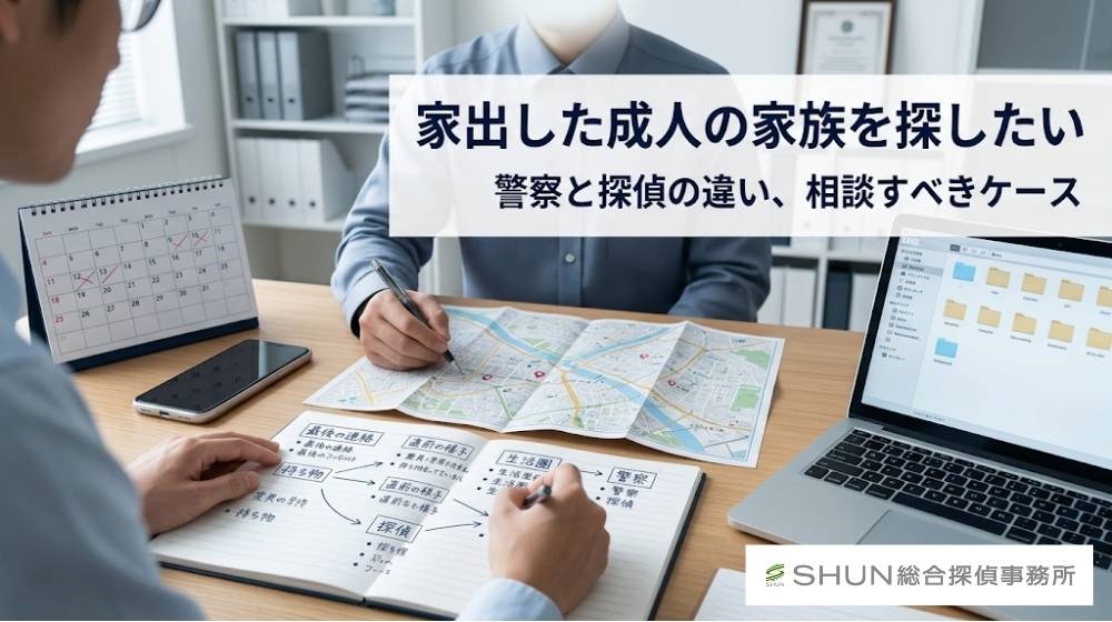 SHUN総合探偵事務所では、単に「見つける」だけでなく、見つかった後に家族関係をさらに悪化させないための橋渡しまで意識して対応しています。だからこそ、成人家出のように本人意思が関わる案件では、警察と探偵の違いを理解したうえで相談先を考えることが大切です。